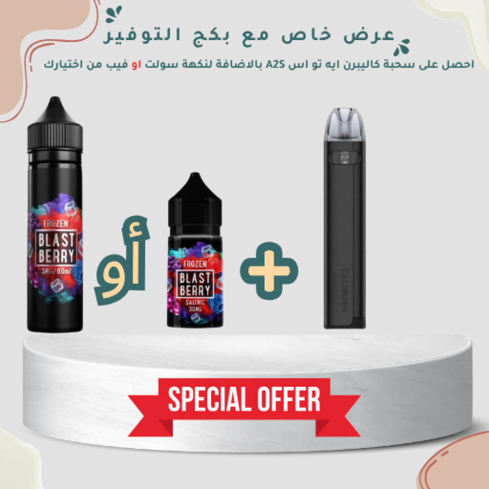 عند طلبك هذا العرض ستحصل على سحبة كاليبرن ايه تو اس A2S بالاضافة لنكهة سحبة سولت او نكهة شيشة فيب من اختيارك مع الاخذ بعين الاعتبار الملاحظات التالية :