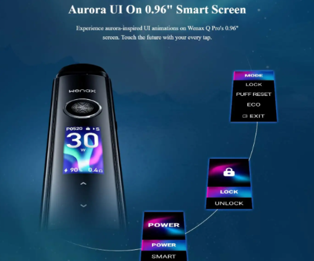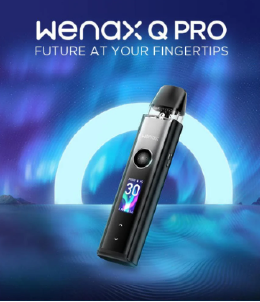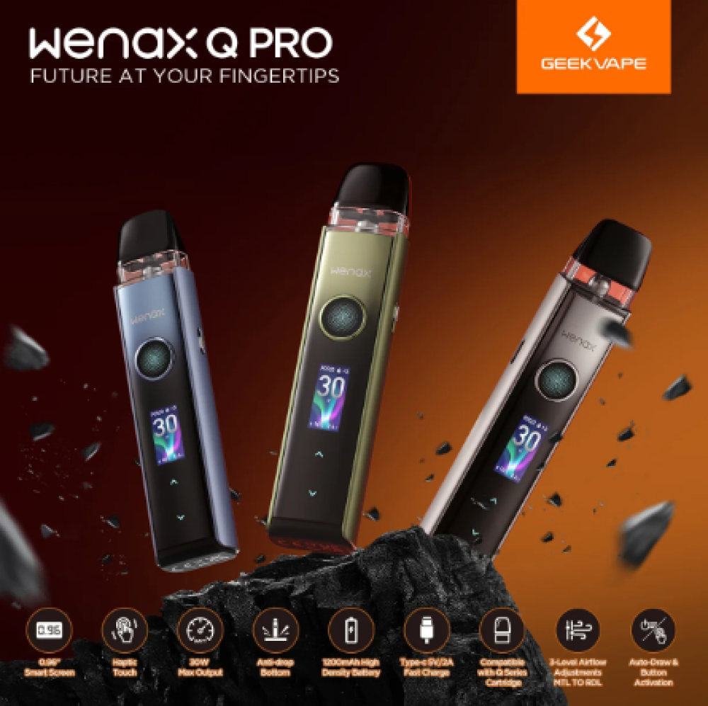 نقدم لكم جهاز سحبة وينكس كيو برو من جيك فيب Geekvape Wenax Q Pro ياتي مع بطارية كبيرة 1200 ملي امبير و شاشة تحكم ذكية و قدرة حتى 30 واط و يعمل مع بودات ويناكس كيو المتوفرة بعدة مقاومات حيث يمكن استعماله MTL او RDL