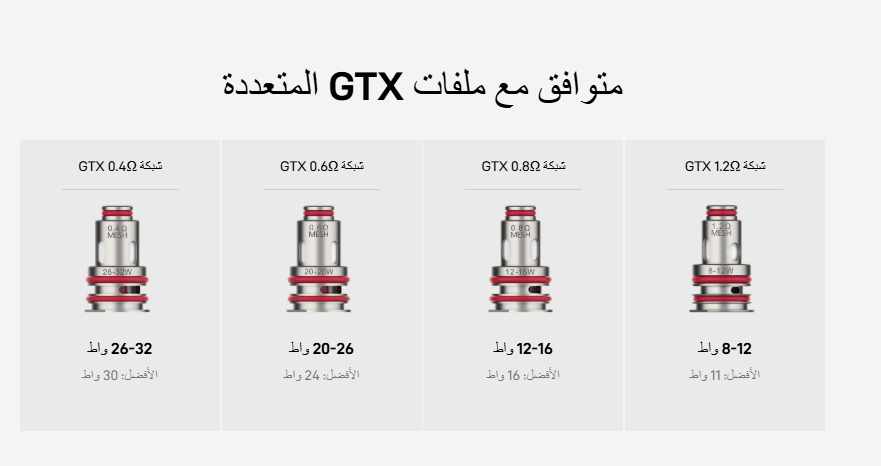 - 1.2Ω (لنكهة مركزة وتدخين MTL مشابه للسجائر)