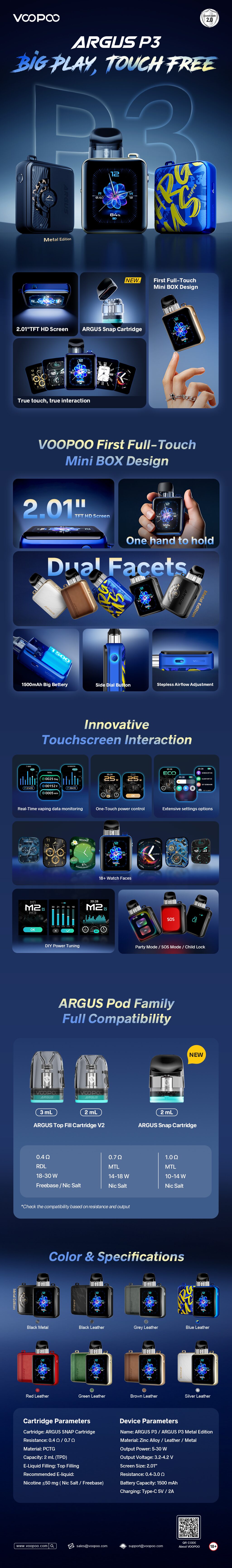 The VOOPOO Argus P3 is the latest and most advanced addition to the renowned ARGUS series, offering a completely different vaping experience with a 2.01-inch true touchscreen inside a sleek and portable Mini BOX design. This device doesn't just focus on aesthetics; it combines intelligent control, stable performance, and a distinct flavor in a single device suitable for everyday use.